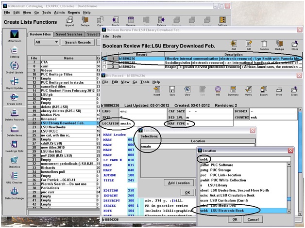 - Selecting a record to update, a new window will appear showing the Bib Record. Note that the Location and Mat Type are incorrect for this Ebrary (electronic) record.