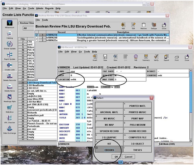 - To change the Mat Type from “a” (printed material) to &ldquo@;” (Ebooks) double click in the Mat Type field and select the correct option as seen below. Click “OK” when ready.