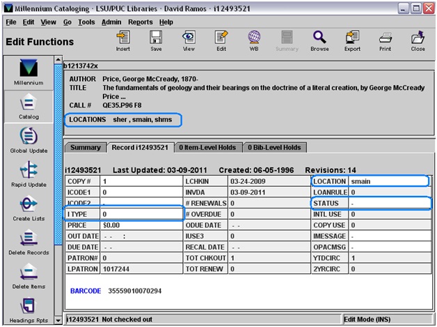 - Status. For circulating collections (such as main, folio, etc.) the status is coded as “-”. For non-circulating collections the status is coded as “o”. This allows the circulating materials to appear as “available” and the non-circulating materials to appear as “Lib use Only” in the public catalog. It is the responsibility of the person cataloging these materials to see that this is correct. Once a year or so a create list may be invoked to assure that none in these categories have been overlooked.