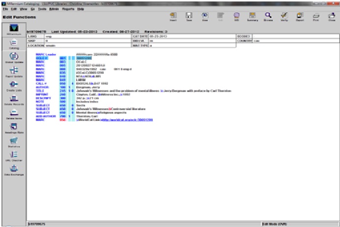 - Click on the Edit icon found near the upper right corner. You will need to find the MARC field 001. This number is needed to delete our OCLC holdings.