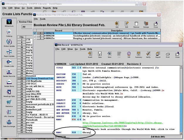 - For La Sierra University Library Ebrary record cataloging search purposes we include a “Marc, 910 field” on all electronic bibliographic records.