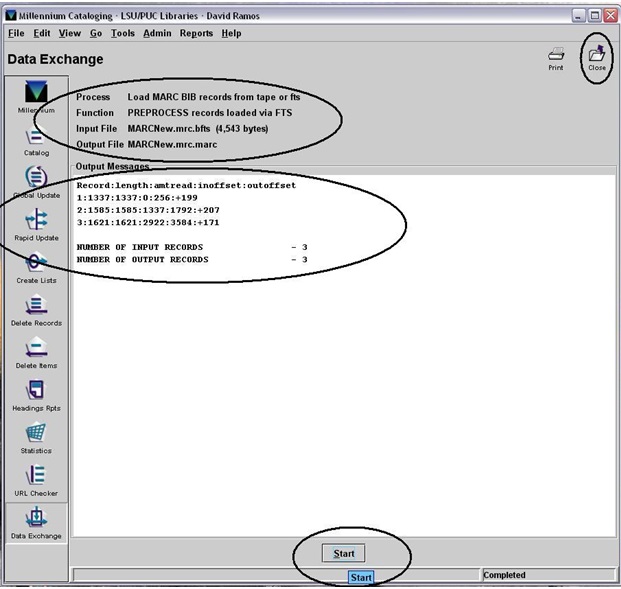 - Click on the “Start” button, and watch the Output Messages scroll the information of the Bibliographic files you are processing.