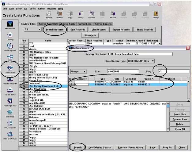 - In the “Create Lists” module, select and empty or designated field for your list search. And select “Search Records”, a new window with a Boolean Search options will appear. Enter the search parameters that will help you find your newly created bibliographic marc records. The above is what we currently use to find new Ebrary records to be processed with Create Lists.