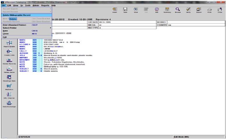 - Click on File on the Millennium screen. A popup menu will appear. You will need to choose Delete Bibliographic Record for this next step.